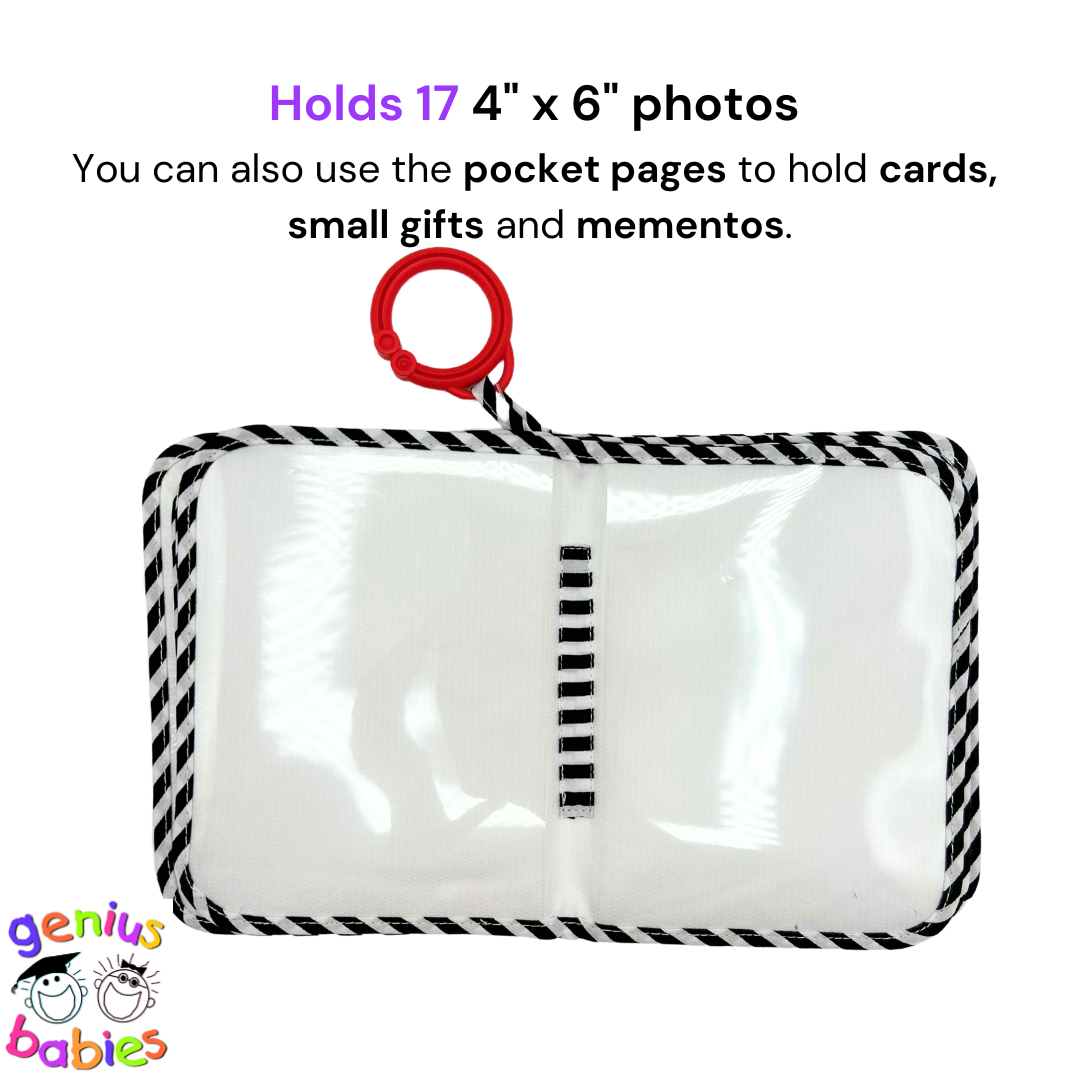 • Newborns see black and white most clearly which is why we designed this my first photo book with those colors. Black and white patterns will help your Genius Baby learn visual focus.